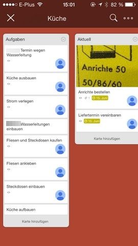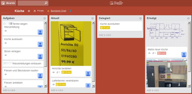 Für dieses handwerkliche Projekt sind es Aufgaben, Aktuell, Delegiert und Erledigt.