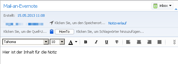 Wenn man nichts angibt, wird die Betreffzeile der Mail als Titel der Notiz benutzt und ins Standardnotizbuch eingefügt.